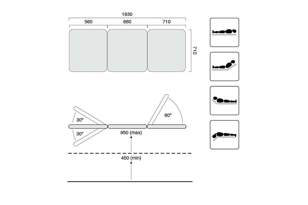 - Height of 450-950mm, 710mm wide and 1,930mm long