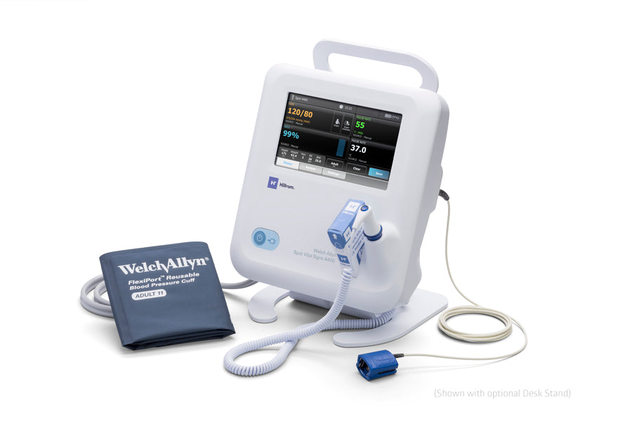 The Welch Allyn Spot Vital Signs 4400 with BP Averaging gives you a simple, all-in-one, touchscreen solution for measuring patient vital signs. Now you can quickly capture a full set of vitals including temperature, blood pressure, pulse rate and SpO2 right from the home screen.