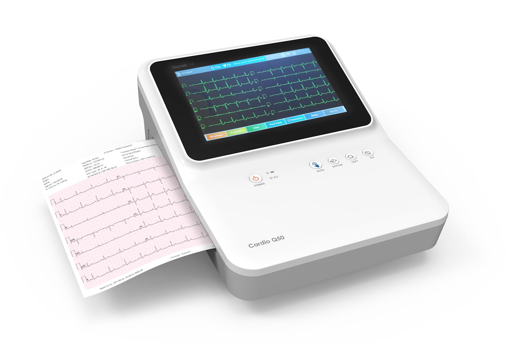 Bionet Q50 12-lead ECG Machine with Glasgow Interpretation, 8" Colour Touchscreen, Built-in Printer and PDF Output